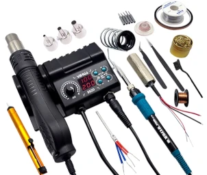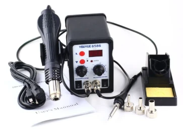 While some hardened technicians would insist on getting things done with a grandfather's kilowatt soldering iron, we suggest you to buy a modern soldering station with a hot air and temperature control. You don't need to be fancy, an entry level soldering station like YIHUA 882D, or JCD 8898, or YOUYUE 8586 would do, and it won't break the bank with its price tag of $50-70, more or less.